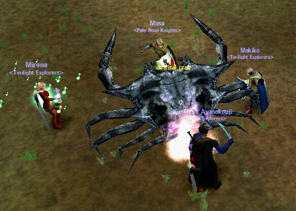 Bog周辺に足を延ばして雑魚を狩る。 ここには、オオカミやカエルなど、MagMell周辺でもよく見かけるMobが居る。 40からOrangeですけど(^^; 巨大ガニをPull!! ちゃんと、横向きで移動してきました(笑) |