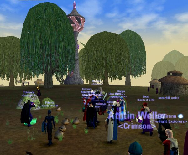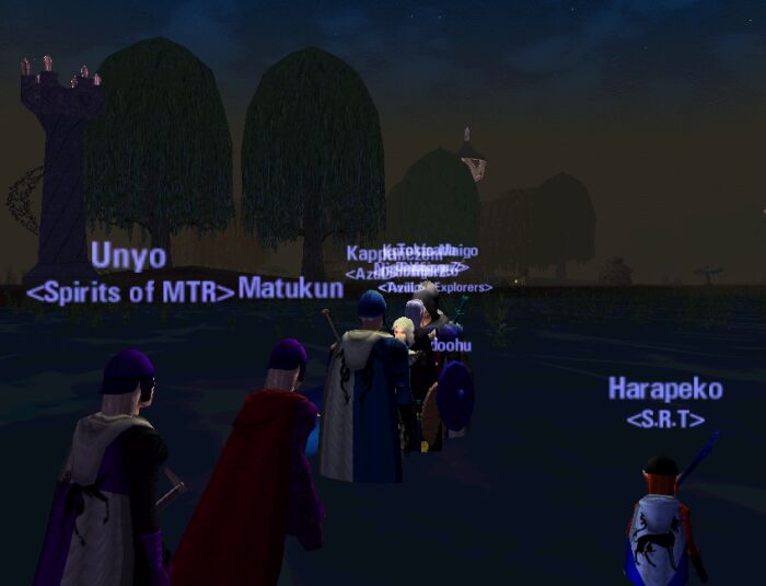 Bogの主、Siabraの女王狩りに3Partyが集まりました。 南側から塔を目指し、闇の中を進軍する。 木の陰にひっそりと塔の明かりが見えます。 Unyo,Harapekoは久しぶり…(※ニセ者) |