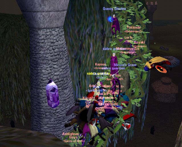 夜明けとともに襲撃! Kinczemの快調なPullで雑魚を減らし道を造ります。 無限に近いポップの中、なんとか塔付近まで掃除。 Pullerが、坂を登り始めます。 後ろにDruidを付け、HealTauntによりQueenをPullする作戦。 山のようなBag…拾っておけば金欠脱出だったのにね〜。 |