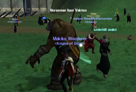 Soul of Samurai(以下SoS)のメンバーと飲み会。 と言っても、内訳はSoS2,Azul2,Zedan1,S.R.T1でしたが(笑) 昼から集まって茶を飲みながらDAoC話。 日が暮れた頃、茶を酒に変えて延々とDAoC話続行(笑) 楽しかった〜。 特に Hiberniaはキャラ性能最強って言うのと、Chanterが如何にUberなのかを聞く。 Savageは瞬発Charaで、CCで押さえられれば打たれ弱いとか。 また、BMはもっと強くて良いだろうという事で合意(爆) SoSとは昔Dennで組んだ事があるが、甘夏さんのHP もののふ奇行を読んでから一緒に遊びたくてしょうがなかったんだよね〜。 ※ しかし、数日後の冬休み廃人プレイでレベルに格差が出てしまいこれっきりに… 2nd PCを整理していたら、懐かしいログを見つけた。 ほぼ1年前 2002/6/14に行われた、TEギルド会議の様子。 (Mirena, Makiko, Kualu, Hachikou が 参加) 時効だろうと勝手に決めてアップ。懐かしさに浸ってください(笑) (誤変換等、一部修正してあります) 最近 1G Roam率が増えてきた。Zerg無い日もあるし。 それだと困ったことが…。 Zergがある場合は、4人でもついて行けばRvR楽しめるけど、 1GだけでEmain歩くならある程度の数は欲しい。 そうなると、LFGしてる時間が長くなる。 2時間のゲーム時間で30分LFG…、なーんかEverQuestを思い出す。 (すぐグループに入れれば良いけどねぇ) 週1〜2で2時間RvRなプレイヤーには辛くなってきたな〜。 |