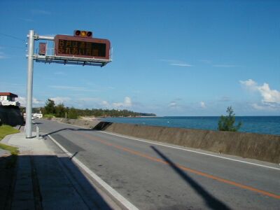 そそくさと岬を出る。う、名護 99kmの看板が…。