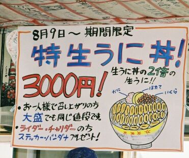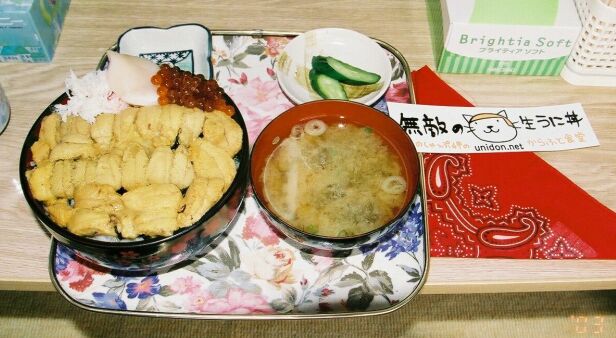 9:50 原野を走りきって納沙布岬へ。ここはピーカンの良い天気。 樺太食堂のウニ丼を食べることに。 オススメの特生うに丼(\3000)にチャレンジ。 美味い!! 普段ウニを食わないから違いがわからんけど、北海道のウニは絶品らしい。 |