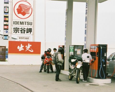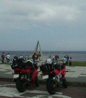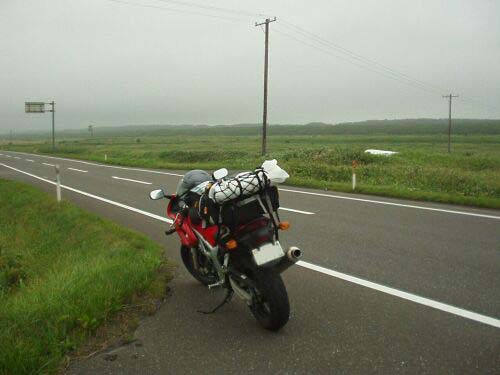 緑が綺麗な宗谷丘陵を駆け抜けて、 最北端の地へ。 三角形で皆が並んで写真を撮る。 俺は興味ないので三角入りバイク写真だけ。 観光もろくにせず、空が陰ってきたので出発。 最北端給油後、R238を南下。 |