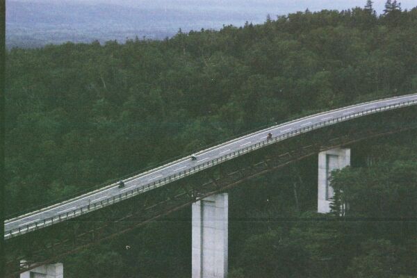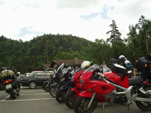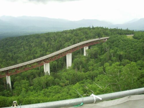 軽く腹ごしらえをした後は、層雲峡へ。 層雲峡→三国峠はさすがに人気コースで 車の後ろをだらだら走る。 崖の景色は確かに圧巻だったが…。 峠の茶屋にて遅い昼食。 俺はカレー、きりしまは天ぷら蕎麦。 三国峠は峠にかかる大きな陸橋が凄い。 陸橋走行中の写真を撮ってもらったが、 暗くていまいち。 |