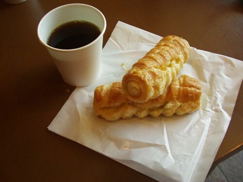 帯広はピーカンの青空。 とりあえず、豚丼の ぱんちょう の前へ。 今は10:00、開店は11:00だそうだ。 なので二人は六花亭へ。 早速サクサクパイを購入。コーヒー無料。 パイシューに似てるが、かなり美味い。 二人ともお土産を大量購入。客単価高い(笑) |