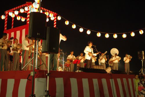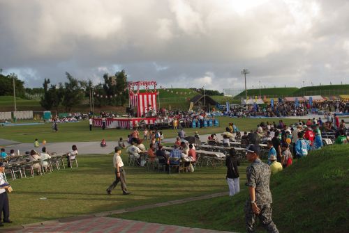 真ん中のステージで、自衛隊員の演奏やミニライブ、盆踊り等が行われる。 奥には多数の屋台が出てて、飲食やくじ、射的などがあった。