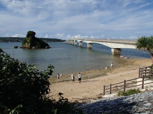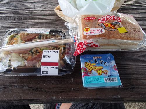 沖縄旅行、北部突入の23と24の話 何だかんだで、予想よりも金の減りが早くて心配だ。 前日寝るのが遅かったので、少しゆっくりめのスタート。 今まで宿泊していた読谷村の宿を10:00過ぎに出る。 今日は古宇利島に移動すればOKな日。 ざっと調べると、名護にベスト電器があるみたいなので、 まずは腹ごしらえ。ファミリーマートに寄る。