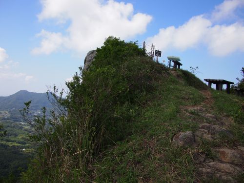 道はなだらかな上り坂。砂利や踏みしめた土の道で歩きやすい。 途中から急登になり、階段の連続。見晴らしの良い展望台に出る。 さて、グローブをするかとリュックを開くけど入ってない。 斜度は60~70度ぐらい。(ロッククライマーは、これで寝てると言うらしいが) 登りはロープをたまに使う位で登っていく。