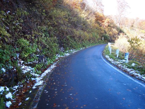 全長60kmほどで、走りきるのに1時間以上かかる。 日影に雪があったり、濡れた落ち葉があったりと