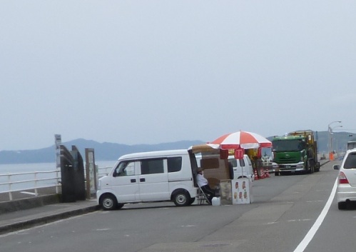 山の中のワインディングから、時折見せる海と島々。 須崎にて、しまむらを発見。 13時半頃、昼食場所に到着。7−8人が並んでる。