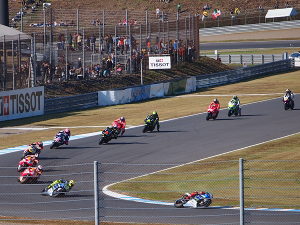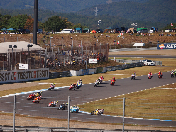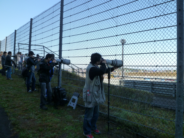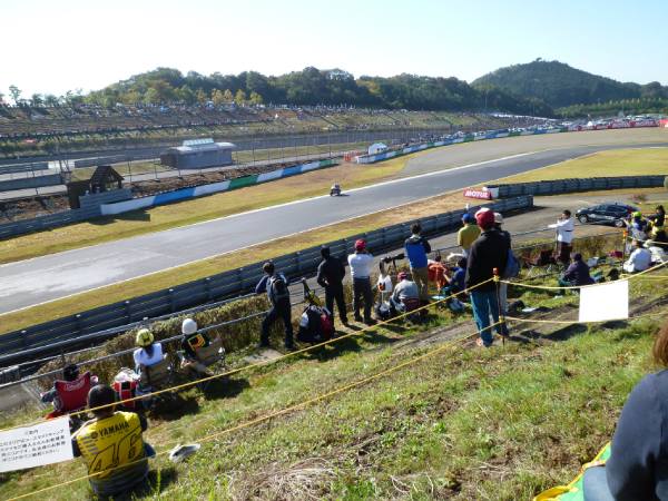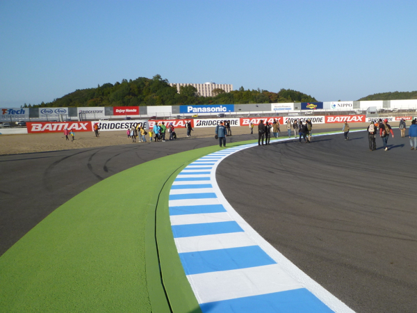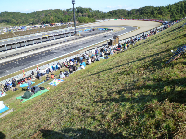 もてぎはテントの横でレースが見れるってのが凄い。 V字コーナーで少し見た後、コース外周をヘアピンに向かって歩く。