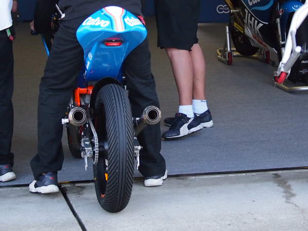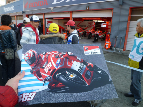 まずは、ライダー大抽選会! そして、公式ショップを物色。 ELFシューズを履いてたので、ELFブースに行って話をしたり、ドカティに跨がったり。 8時過ぎより、Moto3のウォームアップ走行開始。 特に買う物も無さそうなので、観戦場所を決めるべく自由席に向かう。