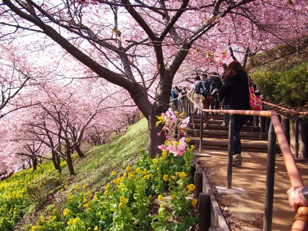 桜の斜面につづら折りの遊歩道がついており、下には菜の花が咲いている。 多くの人が、一眼レフ持参で驚く。