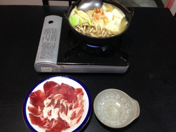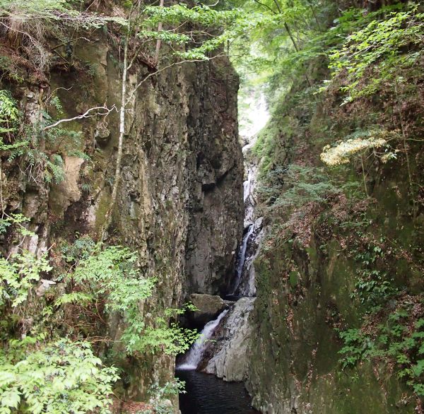 写真ではわかりにくいが、左右の岩の裂け目の奥に滝が見える。 宿に向かう道中、見つけた小さなスーパーで菓子と飲物を購入。 18時頃に上北山村の宿に到着したけど、予約が入ってなかった模様。 夕飯の焼き肉が有名らしいのだが、材料があるということで猪鍋に。