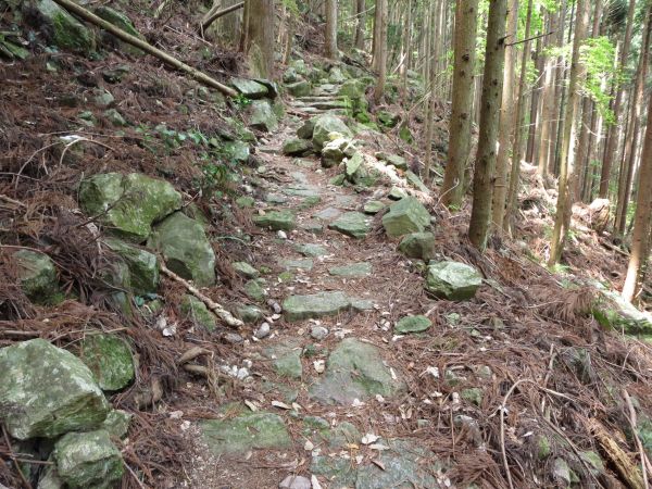 名前からして馬で通ってた様に思えるが、行けると思えない粗い石畳。 20分ほどで、峠に到着。 少し休憩した後、このまま峠を突っ切って海山側の登山口に行くか 最近の運動不足で足に不安があったので、天狗倉山に行くことにした。