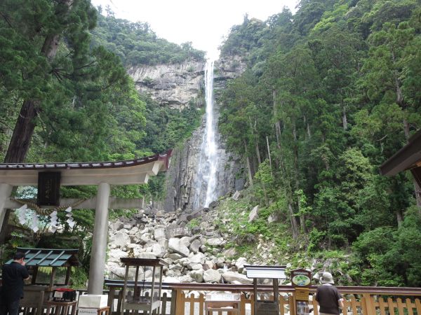 県道を走ってると、遠くに滝が見える。 バイクは駐車場の隅に停めて、那智滝へ。