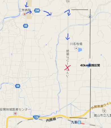 少し走って7-11で休憩、それにしても暑いぞ。 県道92→R465→県道182と走って行く。 県道34→県道88へ。 今回は、県道88からグリーンラインに入るつもりだったが看板が全く無くて入れず。 県道296で東に少し走って、グリーンラインに入った。 この辺は舗装は古いけど畑の中の一本道、軽自動車をパスして加速するも とはいえ、十分な速度が出てたのは確か。 え!? 俺? しかいないよね・・・・。あちゃ〜って感じだった。 音楽を聴いてたので、白バイが後ろにいたのに全く気がつかなかったよ。