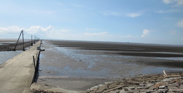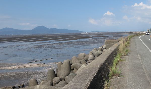 R57天草街道、島原湾から潮が引いてて凄い景色だった。 御輿来海岸自然公園で少し休憩。