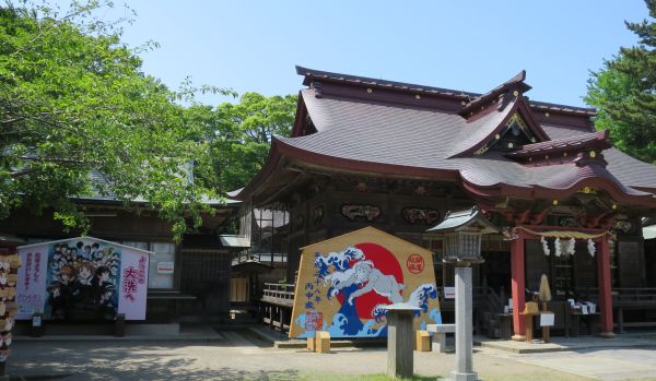 祈祷受付もやっており、お守りなどの販売もある大きな神社みたいだ。 そのまま海岸線を南下。那珂湊漁港の市場周辺は車だらけ。 那珂川を渡り、海岸線を南下して大洗磯前神社へ。