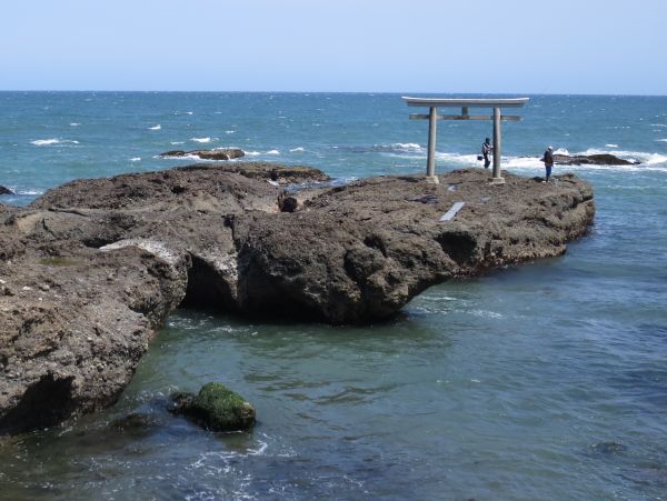 参拝しつつ、絵馬を眺めたり。 境内に海洋博物館があったので覗いてみる。 海の方にも鳥居があり、せっかくなので近くまで行こうと思ったら で、途中の岩に着地した所で嫌な予感が。