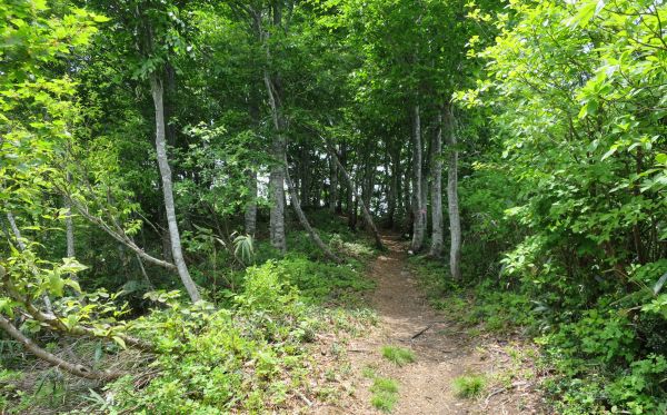 牧場の作業道を歩いて、ゲートの様な登山口から山道へ。 最初は水平動の移動、林道を越えた当たりから登りになる。