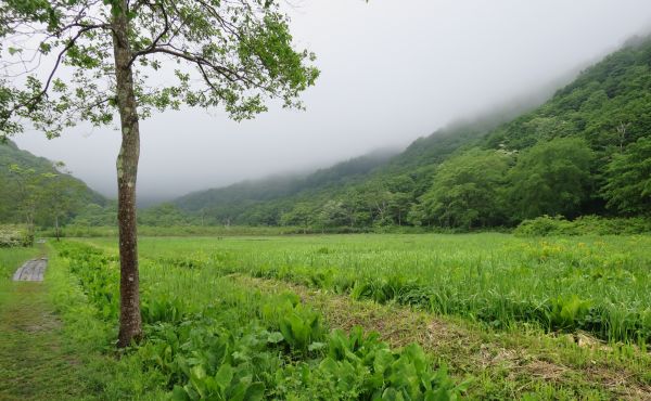 この後のプランは何も考えて無く、テキトウに散策しようと思ってた。 雨の勢いは増してきたけど、すぐに止むだろうとウインドブレーカーだけで歩く。 車道を少しあるいて湿原に向かう途中、強い雨が降ってきた。 そして湿原に着いて少し歩いてると、雨が弱くなった。