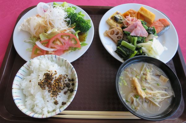 蒸し物、焼き魚、天ぷら等は追加で出てくる。 兄は早々に就寝、自分はテレビを見つつ、寝る前にも風呂に入る。 -------------------- 昨日と違い晴天、降水確率も0%なので良い山行に期待が持てる。 朝風呂の後、朝食へ。