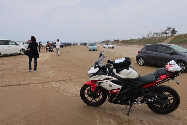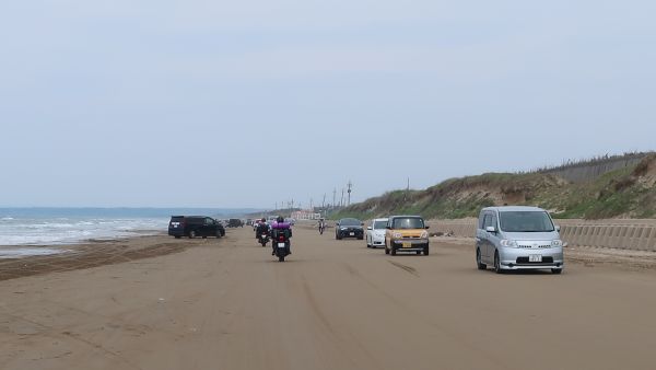 砂浜の中間部分が走れるようになってて、海側が駐車スペースな感じ。 路面は締まってるけど、グリップは無いので曲がるのは難しいだろう。 写真を数枚撮影したけど、足は沈むので数分以上停めるなら
