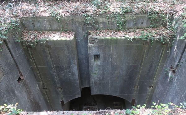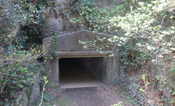 第一展望台へ。景色としては、第二の方が良いかな。 朝から何も食べず空腹だったので、豚串と桜餅セットを購入し木陰で休憩。 休憩の跡で、補給倉庫っぽい要塞跡を見る。