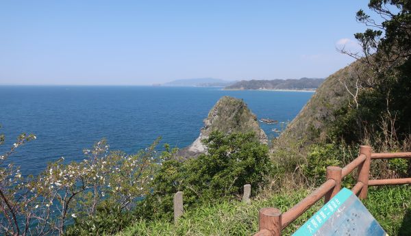 弁財天の洞窟がある様なので、海岸近くまで降りる。 海まで降りると、釣り人が数人ほど。 その後、長い階段を登って第二展望台まで戻る。 第一展望台に向けて歩く。