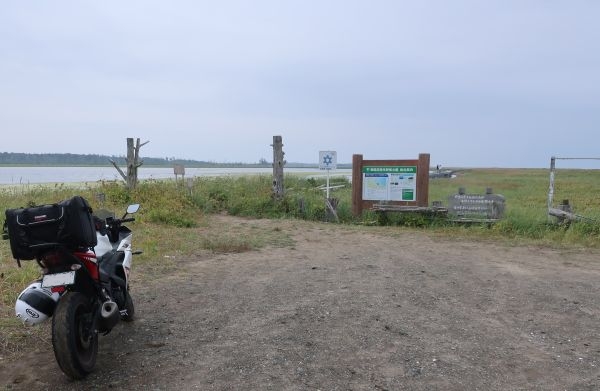 自然の景色は素晴らしいが、城跡愛か想像力が足りてないので萌えない。 次の目的地、春国岱へ向かう。 途中、根室市街を通るときにエスカロップが食べれる喫茶店の前を通ったが R44を走って春国岱のネイチャーセンターへ。 国道から海岸沿いに降りて、春国岱の遊歩道入り口にバイクを停める。