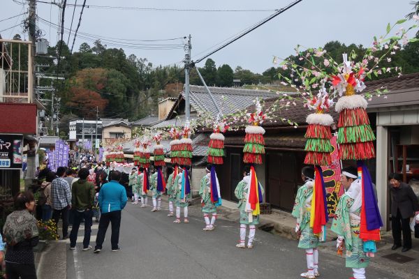 最初は小学校跡地のグラウンドで始まり、200mぐらい先にある神社まで歩く。 主役は花を背負った青年たちと思うが、ハッピに謎楽器を手にした子供たちや