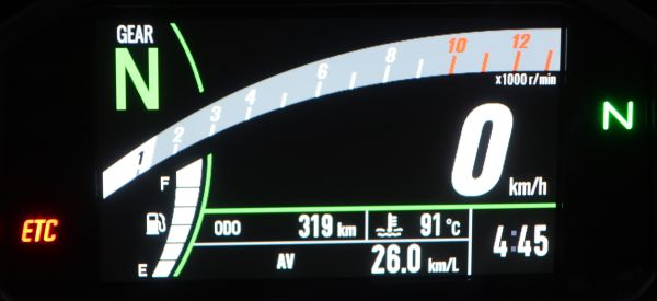 ギアと速度はわかりやすいが、タコは見にくい。(今は4000回転で点滅する様に設定)