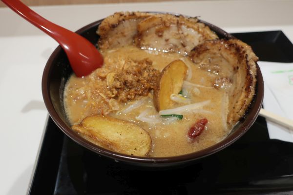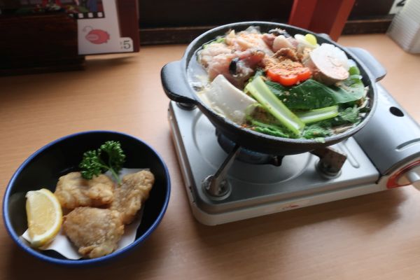 駅内にも大きなガルパンのタペストリーがあったり。土産屋は相変わらず。 推しキャラ秋山さんの菓子店に行くも、定休日でパネルが出てなかった。 昼食にブロンズの鉄板ナポリタンとも思ったけど、外にも並んでたので 次は、大洗まいわい市場へ。 うさぎさんチームのマーク(殺伐ウサギ)が好きなんだけど、 良さそうに思えたステッカーを3枚ほど購入する。 あんこう鍋1人前からと看板があったので、ここで食べることにする。
