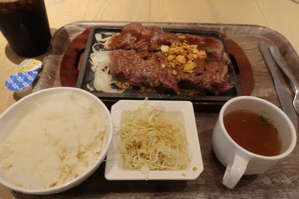 空港方面から那覇西走路へ。 昼食予定の浦添パルコまで4km程なので、雨の中を強行する。 ステーキハウス88Jrへ。看板メニューのJrステーキ 400gを注文。