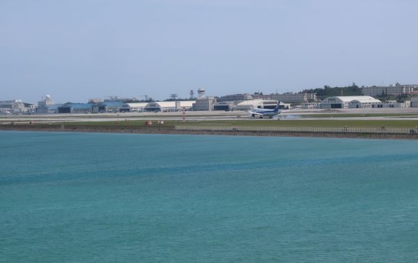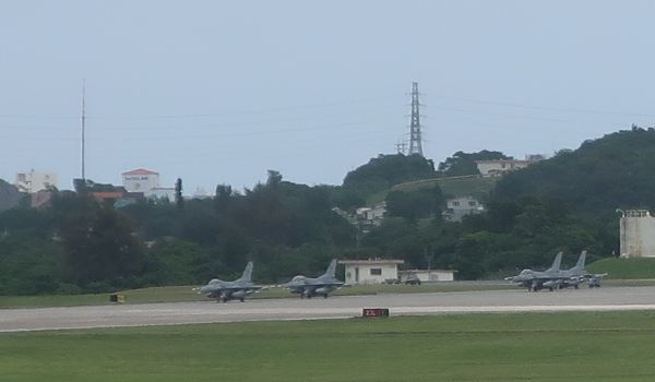 混雑するR58を走り、道の駅かでなに到着。嘉手納基地が一望できる。 ちょうど4機のF-16が離陸するタイミングだった。