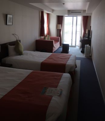 林道を走って名護中央公園 展望台に行くも、逆光で写真はイマイチ。 山を下って、17時過ぎにホテルに到着した。 部屋はツイン、無駄に広い。 とりあえず、風呂にお湯を張る。 酒提供が19時までなので、慌ただしく注文する。