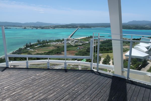 写真撮ってる人多数。橋を歩いてる人もちらほら。 前回来たときは行かなかったオーシャンタワーへ、入場料850円は高いよ。 駐車場からは自動カートで移動、アトラクション風なんだろうか。 貝の博物館フロアは通過して、展望台へ直行する。