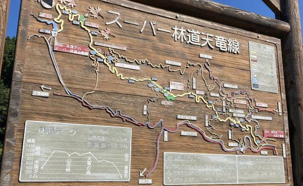 中間地点の天竜の森を通過する。 麻布山登山口には、登山者と思われる車が7-8台ほど駐車していた。 その先の道は荒れまくりで、落石だらけ。ほとんど誰も走らないんだろうか。