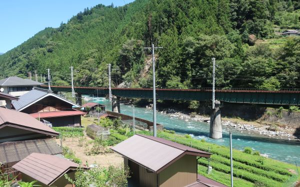 ちょっと多かったけど、安定した美味さだった。 R473からR151へ。ぐるっと遠回りだけど、兵越峠が通行止めなので仕方なし。 道の駅 豊根グリーンポート宮嶋で休憩、抹茶フラペチーノで体を冷やす。 15時過ぎに天竜龍駅に到着、駅前の駐輪場にバイクを停める。 予定より1時間ほど早く余裕があるので、1時間の散策コースを歩く。