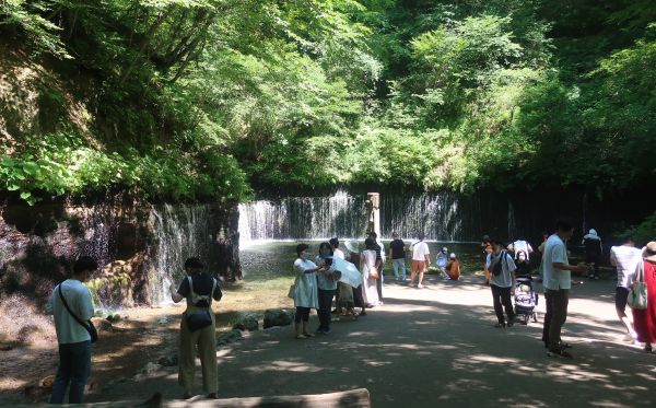 梅雨が明けて猛暑の東京から逃げるように、涼しい長野へ走りに行ってきた。 土日が晴れそうなので、ゆるキャン△聖地巡礼な感じの静岡ツーリングに行く予定だったけど 渋峠を走るなら鬼押出し園に寄りたいし、奥志賀林道を走って野沢温泉に泊まるのが良さそうだ。 去年と同じ温泉宿を予約、ちょっと奮発して焼肉付きの高いプランにした。 ---------- 6時頃に起床して出発準備、まだ早朝なので少し涼しい。 首都高速は順調に流れており、川口JCTから外環に乗って関越道へ。 90分ほどで上里SAに到着する。 朝食は、みたらしコッペパンと思ってたけど見当たらず(高坂SAでした) まだ8時過ぎだが、気温が上がってきた。 碓氷軽井沢ICで降りて、混雑した下道を走って軽井沢駅前を抜けていく。 せっかくなので、白糸の滝に寄る。 駐車場から川沿いを少し歩くのだが、遊歩道に入った瞬間から涼しい。