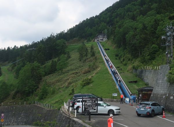 まずは、スカイレーターというエスカレーター的なのでリフト乗り場へ。 スカイレーターで移動中、めちゃ虫が多い。 他の乗車客も、ハンカチなどを振って追い払ってる感じ。 リフトで山頂に到着。まずは、屋上にある展望デッキへ。