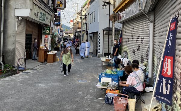 肉を焼きつつ、生ビールが美味い。 生ビールの後は、岩魚の骨酒を注文。 最後にご飯も2膳食べて、腹いっぱい。 近所にホタルが出るという話で、8時ぐらいに外出予定だったけど 深夜に起きて、宿の風呂に行く。こっちも源泉かけ流し。 ネット見たりした後に就寝。 --------- 駐輪 :ホテル前 ---------- 6時過ぎに宿を出て、散歩がてら朝市へ。