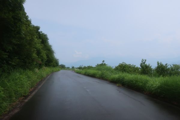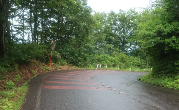 湧き水があったので、ペットボトルを飲み干して補充する。 30分ほど滞在し、10時に出発する。 雨脚は強くないし、とにかく暑いのでクールダウンになるだろうと強行する。 雨は弱まってきたけど、路面はウェットになってしまって残念だ。 つづら折りで高度を上げていく。