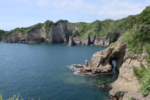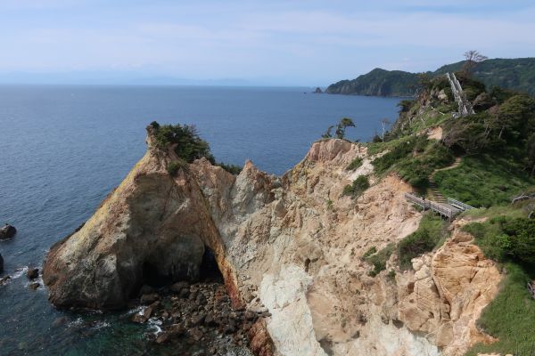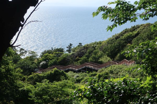 ダイナミックな岩の海岸線。 遊歩道があるので、木の階段を登って富士見の丘へ。