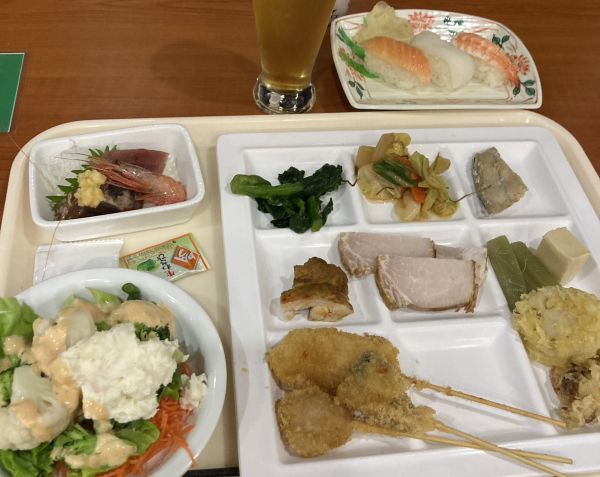 時間になったので夕飯会場へ。 2年前の下田の宿と同系列で、低価格で食べ飲み放題の夕飯を提供してる宿って感じ。