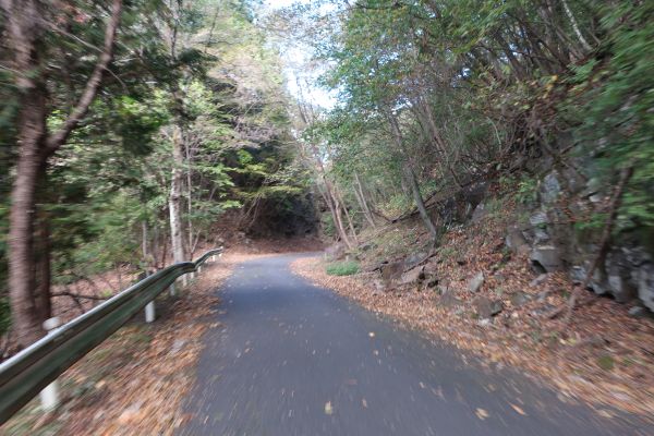 道が狭くてガタガタだったり砂利が浮いてたり。 熊鷹山登山口を超えて、林道三境線へ。 川沿いでなくなり景色がイマイチになるけど、路面は乾いて 三境峠を越えて下り坂になる。