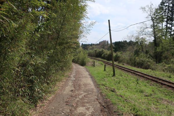 すれ違うのが難しい感じの道で、路面も悪い。 トンネルを2つ抜けると、下りの悪路に。 下りきると線路沿いに出た。