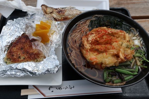 しょうがないので気を取り直し、養老の滝に向かう。 ここにキョンの串焼きがあるという話だったけど見当たらず。 中野食堂で蕎麦と焼きおにぎりを購入し、屋台の鮎の塩焼きとドッキング。