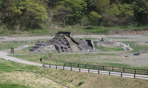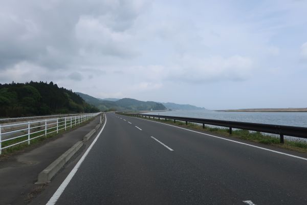 防潮堤のある海岸線、そして山間部を交互に走る感じ。 たまに震災遺構なのか、被災そのままの建物も散見された。 新北上大橋を渡って、川沿いを走る。